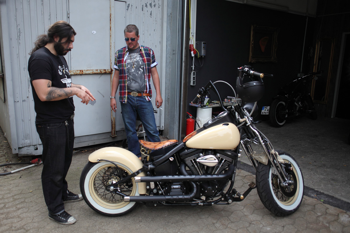 Alle Motorradfahrer werden von mir gegrüßt und gleich angesehen, egal was genau sie fahren. Ich fahre gern im Alltag, zur Arbeit und hier am Niederrhein zu Terminen und natürlich mit ein paar Kumpels zu Treffen. Ich hatte vor der hier vorgestellten Harley eine Sportmaschine und damit einen schweren Unfall. Um ein wenig Druck aus der Sache zu nehmen habe ich mir die Harley gekauft, mit der man auch sportlich fahren kann, ohne gleich in unbeherrschbare Regionen vorzustossen. Ich habe Spass daran sie in meiner Garage die ich mit Freunden teile umzubauen, selbst zu pflegen und zu warten. Derzeit konstruiere ich eine Beifahrersolositz für meine Frau. Meine Motorräder müssen gut fahren, funktionieren, gut klingen und dabei möglichst gut und individuell aussehen, also eine gesunde Mischung aus moderner Technik und klassischer Optik haben. Fahrten in uniformierten Gruppen sind nichts für mich, auch möchte ich nicht mit Tattoos oder ähnlichem hart wirken, sondern lieber als sportlich wahrgenommen werden. Spass und Lifestyle stehen an erster Stelle.