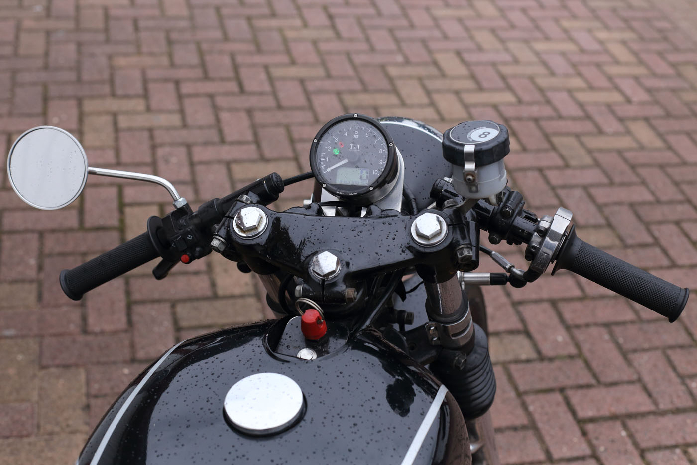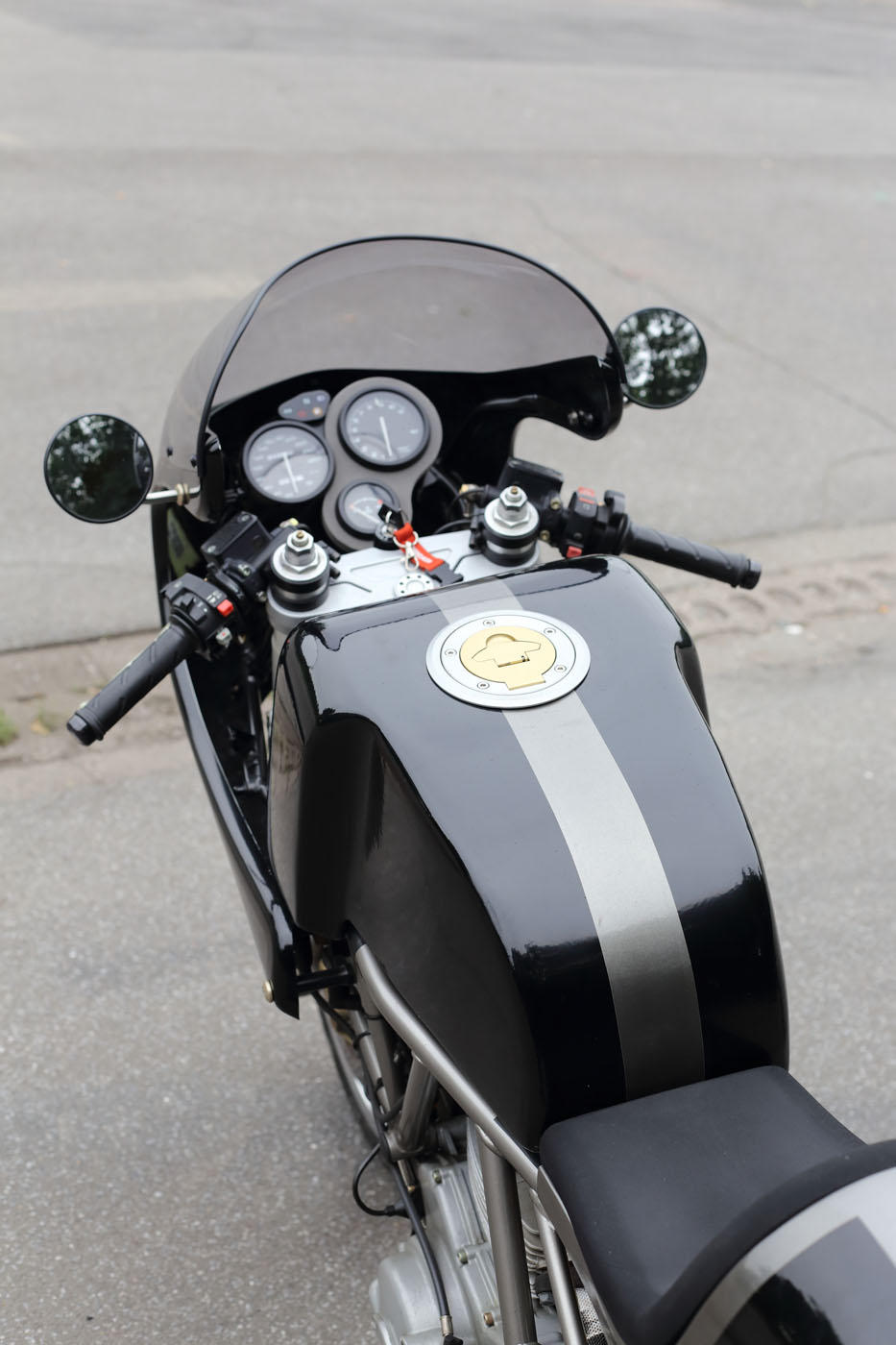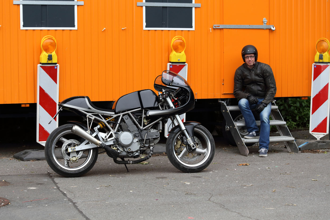 Mein Fabel für die Fahrt auf 2 Rädern begann mit 6 Jahren auf den Pedalen eines BMX Rades. Meinen Führerschein erwarb ich aber erst 27 Jahre später und kaufte mir eine Suzuki GS 550 die ich erst einmal ordentlich umgestaltete. Es sollte unbedingt ein Cafe Racer werden, denn die fand ich schon seit Ewigkeiten cool, genauso wie das Ace Cafe in London. Auf den ersten Blick scheint die Suzuki lediglich optisch ein paar Veränderungen bekommen zu haben, aber das täuscht. Hier hab ich nicht nur mein bestes gegeben, sondern auch 5.000 Euro investiert. Zum einen bin ich ein totaler Basteltyp, strebe in erster Linie Funktionalität an, wie zum Beispiel den Ölkühler den es bei diesem Modell nicht gibt. Ich suche auf dem Motorrad wie einst mit dem BMX Rad die Bestätigung das ich Belastungen aushalten kann. 2x im Jahr geht es mindestens auf Tour. Rucksack auf und los. So war ich in 5 Jahren in der Schweiz, Österreich, Italien, Frankreich, Spanien und England mit dem Motorrad unterwegs. War auf interessanten Cafe Racer Veranstaltungen und habe viele Leute getroffen.