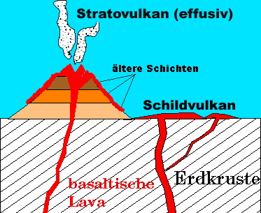 Ein oder mehrere Schlote bilden das Zentrum der vulkanischen Ergüsse. Kommt es in regelmäßigen Abständen immer wieder zu neuen Ergüssen, so bilden sich aus der Schichtung erkalteter Lavamassen die Decken- oder Schildvulkanformen zu Stratovulkanformen aus.