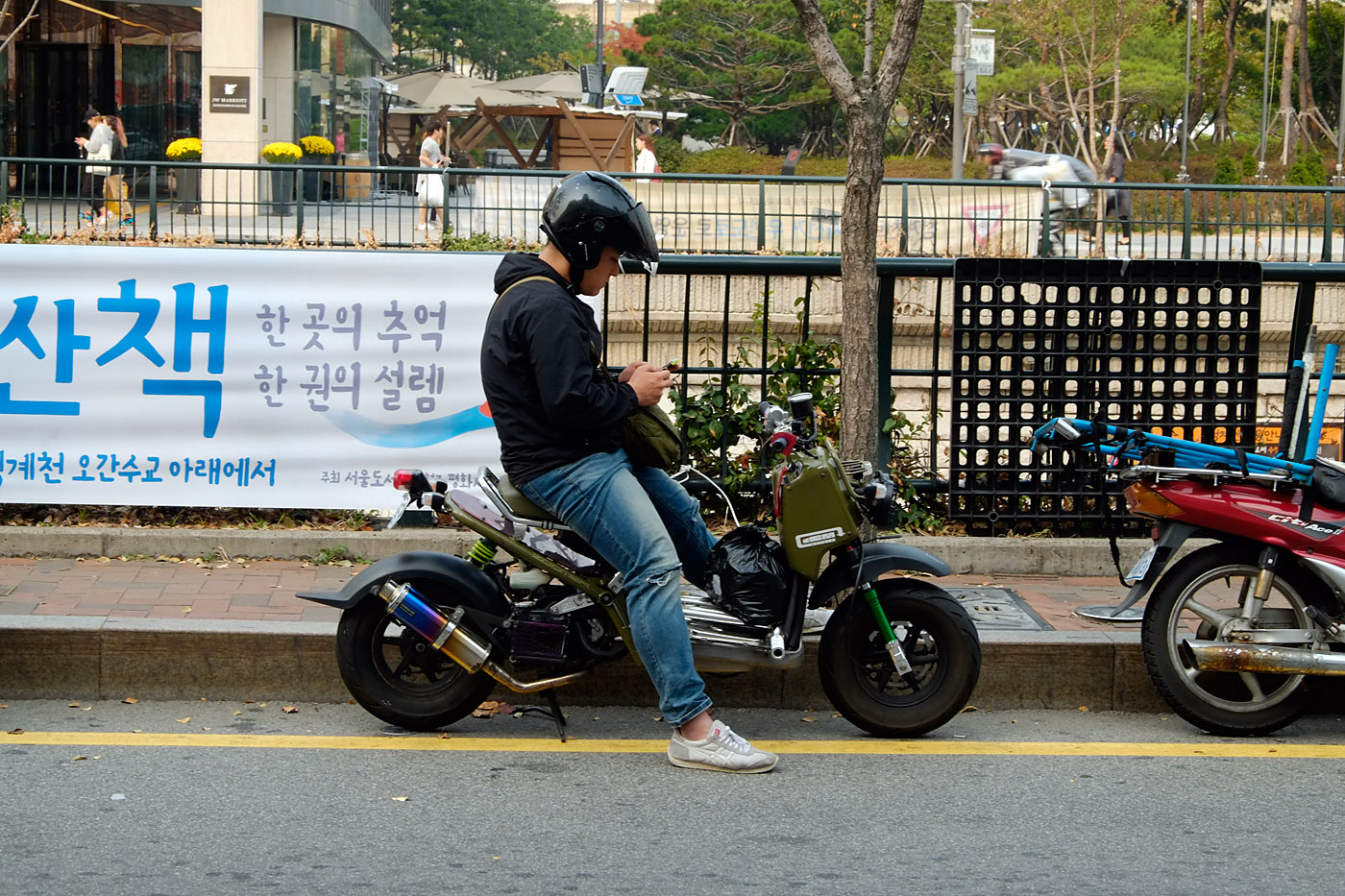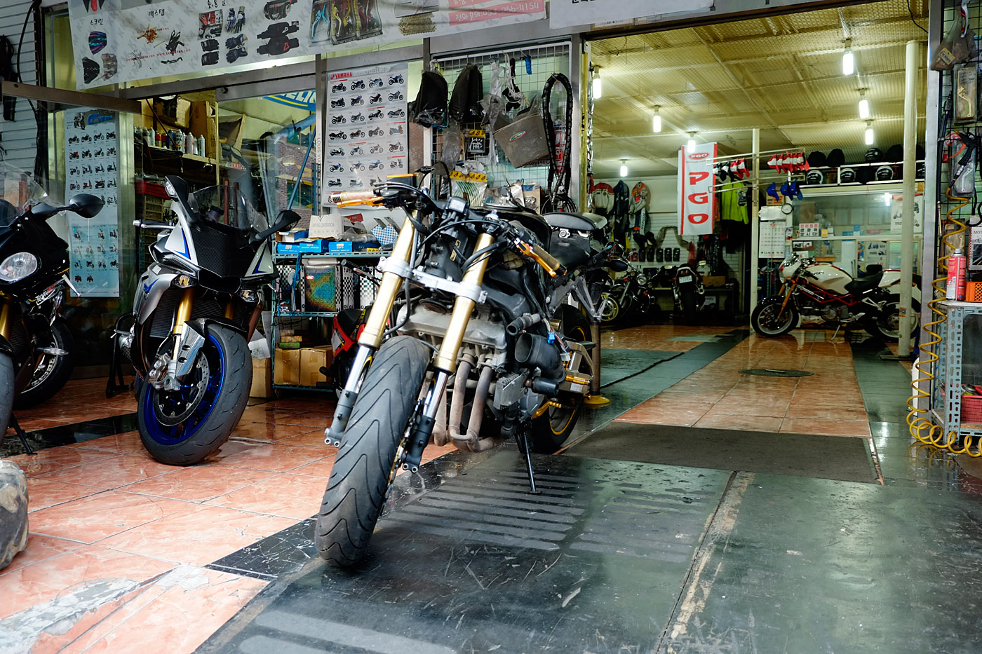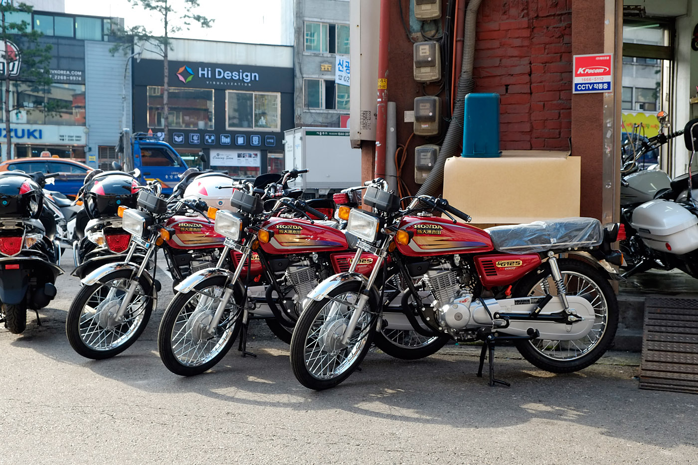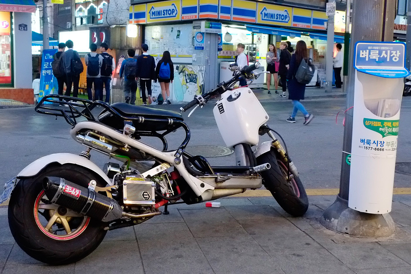 Wenn im Bereich des motorisierten Freidenkertums überhaupt jemand ein zweirädriges Zeichen setzen will, dann greift er zu einem Model das extrem schnell, extrem aggressiv oder zumindest extrem fortschrittlich und damit extrem teuer daherkommt. Hier stehen vor allem Motorräder der Marken BMW, Ducati, Triumph und Yamaha hoch im Kurs und treffen mit der von diesen Marken neuerdings vertretenen Kultur hochpreisiger Umbaukonzepte direkt in Herz zahlungswilliger Südkoreaner. So rollt die Neuerwerbung direkt in die Werkstätten der Händler um sie dort mit allem zu versehen, was sich so aus den gut gefüllten Regalen anschrauben lässt. Da vieles davon zwar teuer ist, in der gewählten Kombination jedoch mitunter überaus Gewöhnungsbedürftig aussieht, lässt sich inzwischen mit einiger Mühe auch der eine oder andere Kreative finden, der in der eigenen kleinen Werkstatt etwas Customizing anbietet.