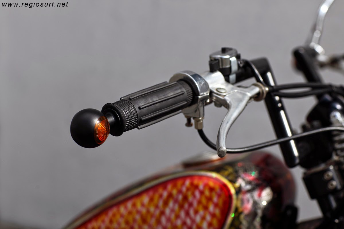 Dieses Motorrad war seiner Zeit zumindest in Europa voraus. Ein wirklicher Trendsetter. Ein aufwendig lackierter und goldig glitzernder Tank thronte auf einem Motorrad, das ansonsten viele unbehandelte Flächen präsentierte. Ein richtiges Backyard Bike. Besonders der schmale handgefertigte Z-Lenker, die schmalen Geländereifen und die unbehandelten Flächen wurden zigfach kopiert. Solch ein Fahrzeug bekommt aber nur in Verbindung mit jeder Menge Beziehungen problemlos den Segen vom TÜV. In einer Fachwerkstatt wie der von Bastian Glacer wird so etwas eigentlich nicht akzeptiert. Dennoch gab er das Teil nicht verloren, überholte den Motor fachgerecht und verbaute Aftermarket Teile bis die TÜV-Konformität wieder hergestellt war. Lenker, Griffe und Blinker standen dabei im Zentrum. Die Lampe bekam einen Einsatz mit EU-Prüfzeichen. Das Rücklicht wurde gegen eine LED getauscht. Ein Tacho von Motogadget wurde installiert, genau wie einfache Schalter aus dem Zubehör. Der Endtopf aus dem günstigen Onlineshop wurde beschichtet und mit zwei Original Krümmern von Triumph verbunden. Der Style des Motorrads blieb weitestgehend erhalten, jetzt läuft es richtig gut und lässt sich so wie es abgebildet ist durch jede TÜV Prüfung bringen. Das freut den Besitzer Thorsten Volkmann, denn er möchte damit fahren.