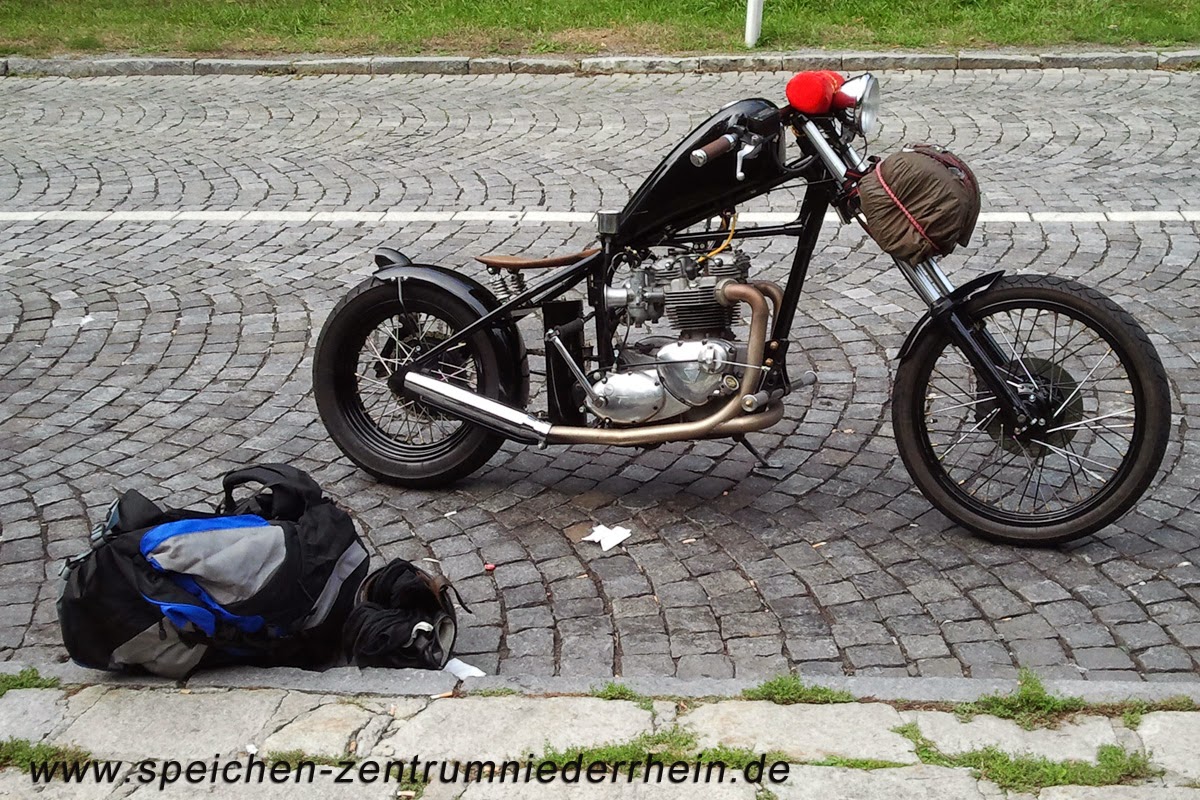 Die Erfindung des Rads war genial, die Erfindung der Speichenräder noch besser. Speichenräder tauchten ca. 1500 vor Chr. in Ägypten auf und sind in ähnlicher Bauweise noch heute im Gebrauch. Speichen verbinden Naben mit Felgen zu einem Rad. Sie können auf Druck, Zugfestigkeit und Seitensteifigkeit belastet werden. Das Rad ist durch die Speichen leicht, stabil und schön, ideal für Fahrräder und Motorräder. Das dachte sich auch Peter Markus aus Duisburg, der ein Custombike Projekt - eine Yamaha XS 650 - mit 23" Rädern vorn wie hinten ausstatten wollte. Peter besorgte sich via eBay 2 Honda XL Felgen, nahm die Naben der XS 650 und fuhr damit zu einem der so gut wie alles über Speichenräder weiß, er fuhr zu Anton Haffmanns Radspannerei nach Kerken im schönen Niederrheingebiet.