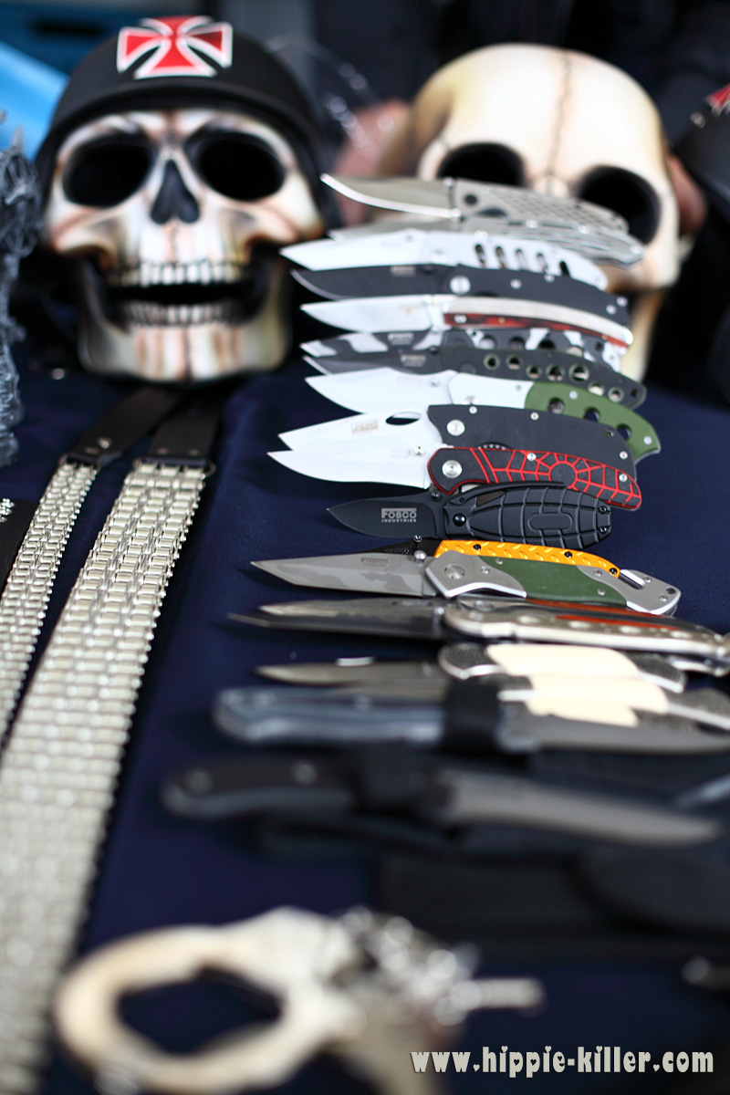 An den vielzähligen Ständen der Halle konnten Helme, Kleidungsstücke, Gürtel und natürlich auch Messer bestaunt und gekauft werden. Der etwas weniger künstlerisch oder handwerklich begabte Chopperfahrer muss "seinen" Stil käuflich erwerben um mithalten zu können. Letzendlich geht es beim Chopperbau und der Ausstattung von Fahrzeugen um die Details, die witzigen, coolen, klugen, verrückten Accessoires machen eine solche Veranstaltung erst zu etwas besonderem. Wer genau hinschaut wird Hunderte solcher Details finden.