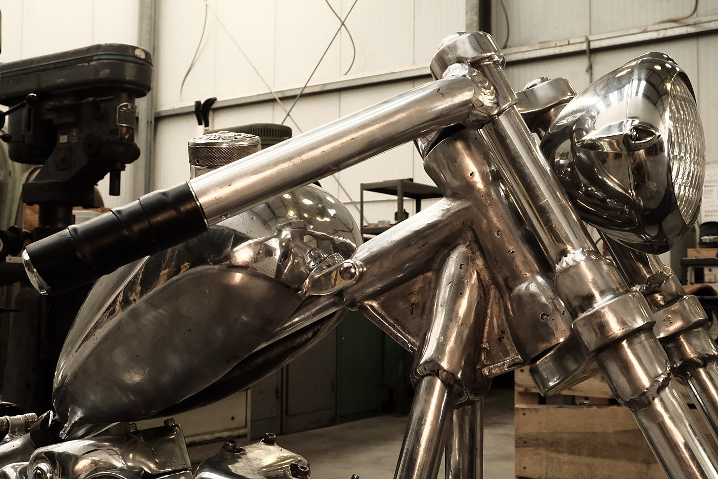 Eine Frage, die ihre Beantwortung in der konsequenten Umsetzung eines kreativen Gedankenspiels findet. Die Realisierung einer Vision, die von Enrico de Haas unter dem Arbeitstitel AISi9Mg auf die Räder gestellt wurde, um die in der Werkstatt von Wannabe Choppers gebotenen handwerklichen Möglichkeiten sicht- und greifbar zu machen und gleichzeitig die Möglichkeiten unterschiedlicher Denkansätze demonstriert. In der Folge ließe sich die Studie über ihre handwerklichen Inhalte hinaus, die hier vor allem vom Bereich der innovativen Gusstechnik gekennzeichnet ist, je nach Bedarf in unterschiedliche Richtungen weiterentwickeln.